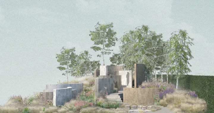 At its highest point, a circular seating area creates a sanctuary for conversation. Set within curved clay-rendered walls, it’s a place to sit side-by-side and share experiences and advice, surrounded by meadow-like spaces and calming birch trees. A gravel path then arcs down to a lower level, bringing people together before the garden opens out before them. In this way, the design reflects how it can feel to open up to others about your mental health. First, it brings people closer, then there is a sense of release and of possibility.